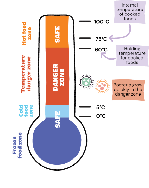 - Keep food at safe temperatures, cold food below 50C and hot food above 600C.